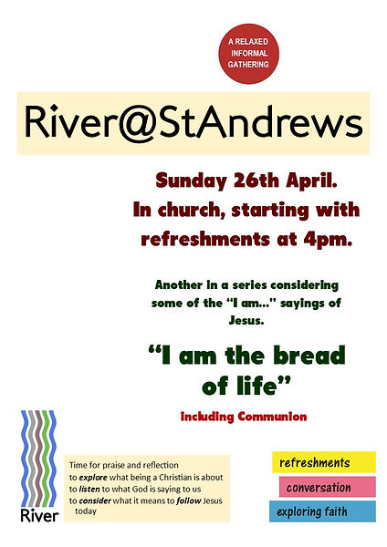 River opens with a time for refreshments and conversation, followed by a time including worship, discussion, reflection and prayer.